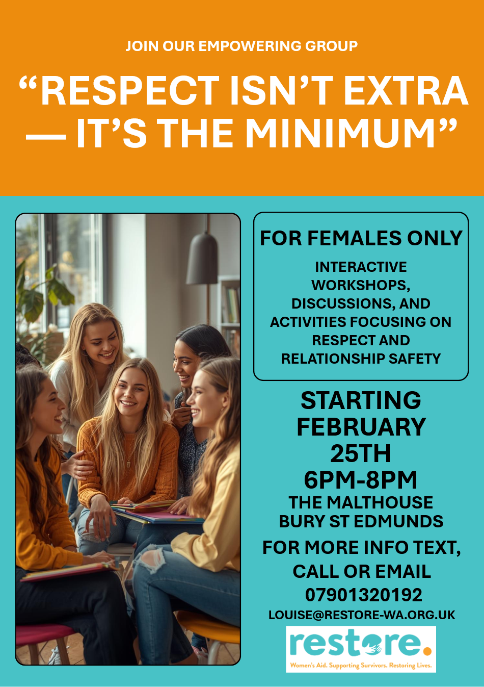 “Respect Isn't Extra — It’s the Minimum” Interactive Workshops, Discussions, and Activities Focusing on Respect and Relationship Safety. For Females Only, Ages 16 - 25 For More Info Text, Call or Email: 07901320192 Louise@Restore-WA.org.uk